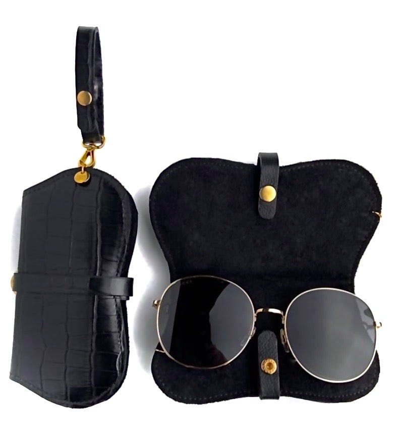 Produzido em couro com textura que simula pele de crocodilo, o porta-óculos croco possui forro macio em suede e acompanha tira com mosquetão que permite prendê-lo na alça da bolsa.